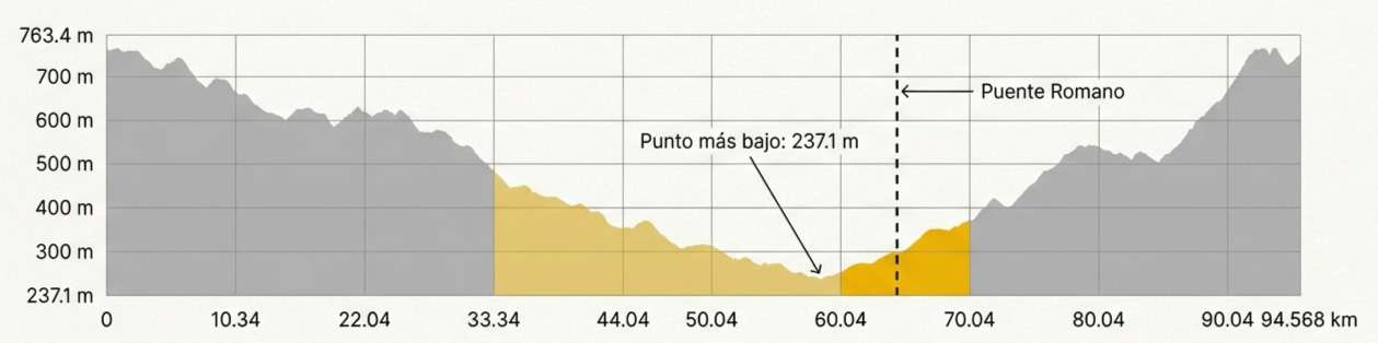 Tras tocar el punto más bajo de la carrera, el terreno cambia de carácter. Se abandona el perfil descendente para entrar en una zona de transición que anticipa el durísimo final. El Puente Romano marca una frontera psicológica.